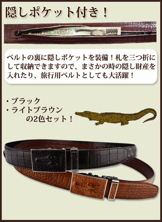 隠しポケット付き 型押しクロコベルト 2色組 隠しポケット付き 型押しクロコベルト 2色組 クロコヘッドがおしゃれな型押しベルト2色セットです。